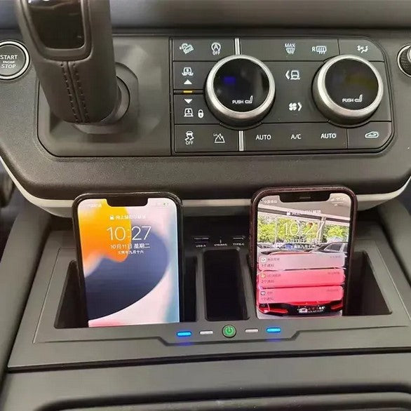 Upgrade your LR Defender 110 with the Wireless Car Charger Mount Storage Box, specifically designed for the 2020-2023 models. This sleek accessory combines the convenience of wireless charging with a practical storage solution, keeping your essentials organized while ensuring your devices stay powered on the go. Made from durable ABS material, this mount is built to last, offering a perfect fit for the Defender 110 4-door models. The black color adds a modern touch to your vehicle’s interior, while the wireless charging feature eliminates the hassle of tangled cables. Perfectly compatible with the 2.2 TD4 4x4 engine, this product is the ideal addition to enhance both functionality and style in your LR Defender.