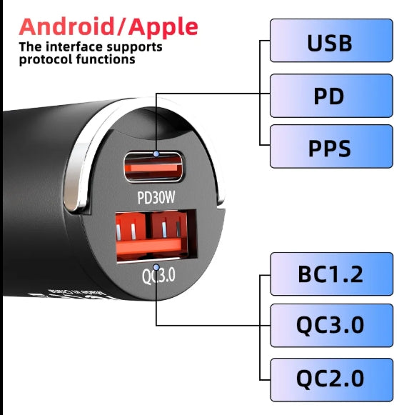 اشحن أجهزتك بسرعة فائقة مع شاحن السيارة القابل للسحب PD30W وQC3.0، المصمم لتحقيق الكفاءة وسهولة الحمل والأمان. يتميز هذا الشاحن المدمج ذو التصميم المعدني بلسان سحب بأنه مثالي لشحن جميع أجهزتك أثناء التنقل – من الهواتف الذكية والأجهزة اللوحية إلى الكاميرات والساعات الذكية وحتى أجهزة اللابتوب.
